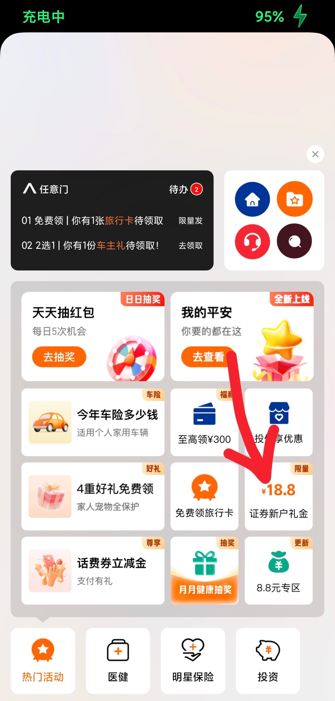 下载平安好车主,如图所示点加号切换旧版,按流程就可以找到新人好礼入口,报名以后去平安证券用报名手机号开户即可,开户很快,真人客服在线验证,回复一个回访短信即可秒开户,然后就能领了