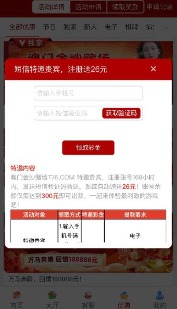 优惠:送26,注册在优惠里自助碰瓷特邀彩金彩金限制电子棋牌捕鱼。10倍流水可出款